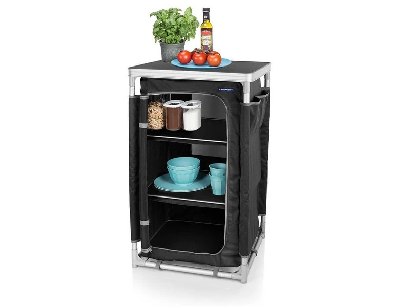 De Campart Travel CU-0719 Campingkast Nice is een stevige campingkast die dankzij het aluminium frame toch licht van gewicht is. Dankzij de drie vakken en extra opbergvakken aan de zijkant heb je veel opbergruimte. Bovendien is de campingkast heel eenvoudig mee te nemen in de opbergtas.