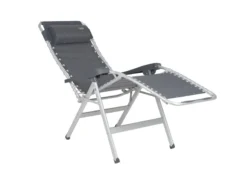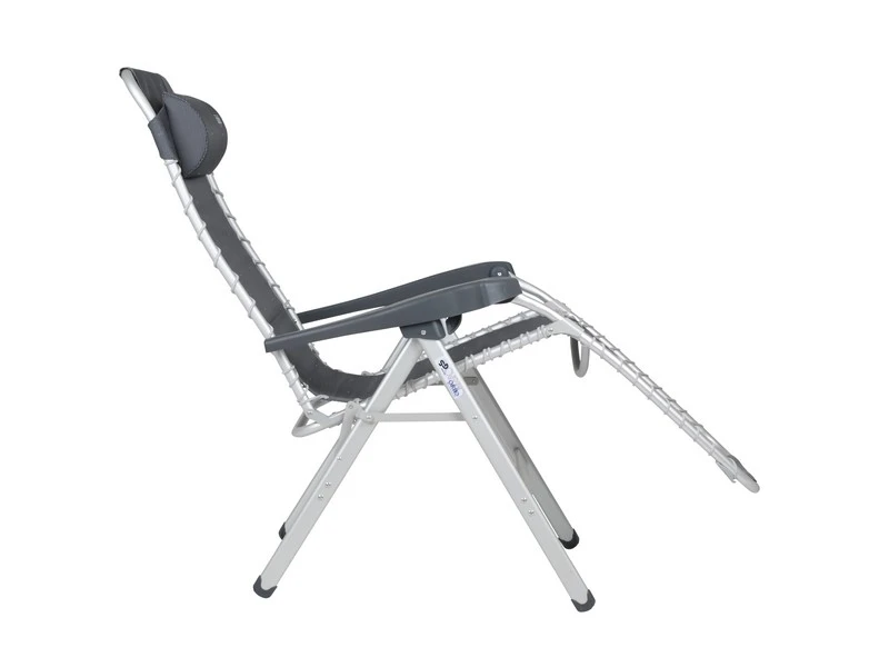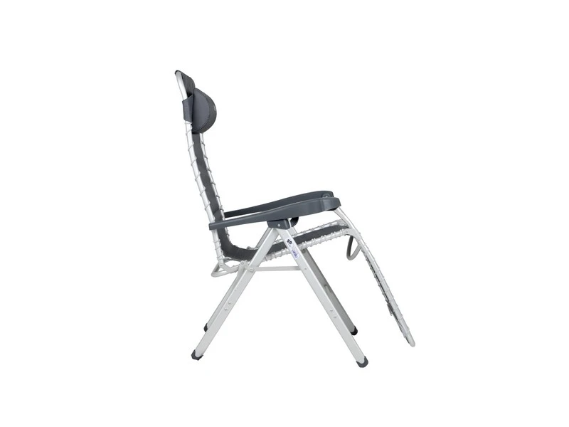 Een zeer luxe en comfortabele relaxstoel met hoofdkussen. Deze stoel biedt maximaal comfort doordat de stoel traploos verstelbaar is en het doek aan het frame bevestigd zit door middel van elastiek. Daarnaast zijn zowel de rugleuning als de armleggers ergonomisch gevormd en is de stoel voorzien van een remsysteem om de stoel in iedere gewenste positie te fixeren. De stoel is voorzien van een geanodiseerd H-frame voor extra stabiliteit en stevigheid. De stoel heeft een extra brede (54 cm), een extra diepe (55 cm) en een extra hoge zit (50 cm). Ingeklapt is deze stoel zeer compact en daardoor gemakkelijk mee te nemen (lxbxh: 95x72x12 cm). Maximale belasting: 130 kilogram.