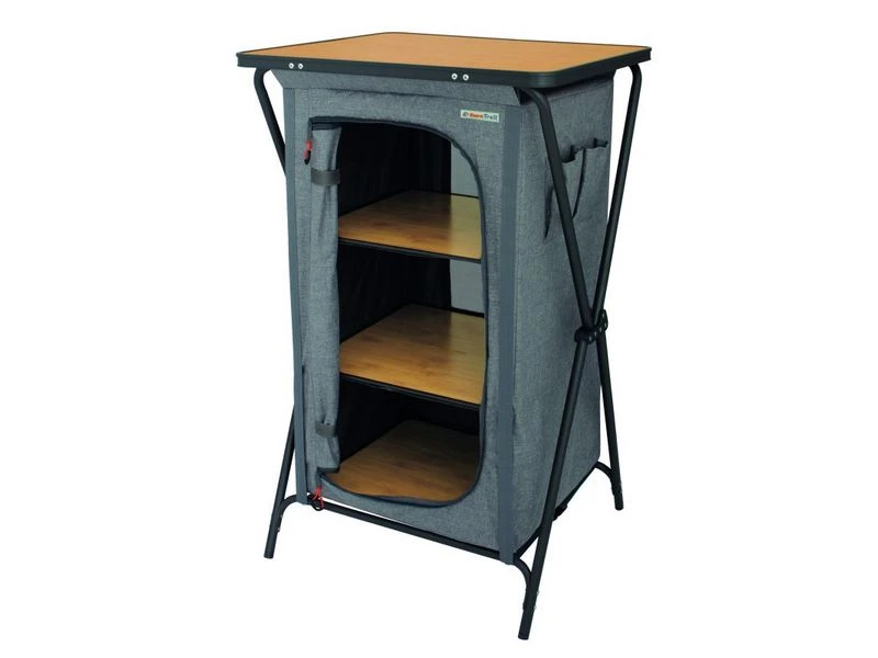 Populaire campingkast, snel op te zetten en met veel opberg plek. 3 etages om al uw keuken of kleding in op te bergen. De Nova Lucera is vervaardigd van het gemêleerd polyester wordt geleverd incl. topblad en stevige etage planken van bamboe materiaal. Verstelbare poten om de kast goed stabiel neer te kunnen zetten. Incl stevige draagtas.