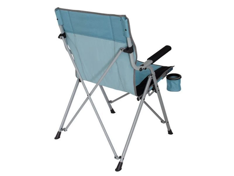 Zeer comfortabele vouwstoel voorzien van stabiele armsteunen en een breed zitvlak. De stoel heeft een stevig stalen frame en laat zich eenvoudig in vouwen. Het ruime zitvlak en hoog rugpand bieden een optimaal zitcomfort. De armsteunen kunnen omhoog geklapt worden waardoor je gemakkelijk aan tafel kunt schuiven. Incl. bekerhouder en draagtas. Leverbare kleuren: blauw/zwart, groen/zwart. Materiaal: 100% 600D Polyester, Frame: staal, Afmeting: 91x64x64cm